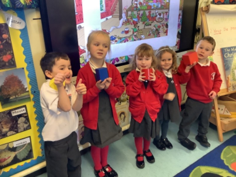 Room 1 have been exploring 3d shapes.Children looked at the 2d faces which help to form the 3d shapes. They investigated which shapes we can build with and which shapes roll. Today we had an indoor shape hunt(due to the weather) to help fill Santa’s sack with presents. The children used their observational skills to find shapes hidden in the classroom and named these as they placed them in the sack. Afterwards we sorted the shapes for different properties and then the children completed their own cut and stick activity. Our exploration of 3d shapes links directly to our play building with wooden blocks and wrapping Christmas presents using junk materials.🙂