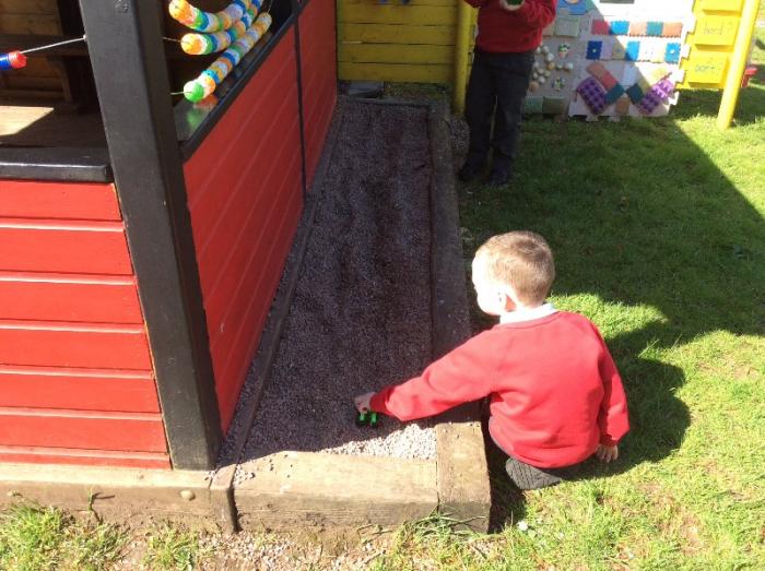 To begin with we explored the distance travelled as a tractor race. Children soon recognised that the larger tractors travelled furthest so our testing wasn’t fair. Through questioning they decided to group themselves according to the size of their tractors. Separate Races were held for small, medium and large tractors, with the furthest distance recorded using a coloured marker. Our visual results showed us that the large tractor went furthest, next surprisingly was the smallest and the medium tractors travelled the shortest distance. The children were keen to try testing their tractors on a different surface opting to use the grass. Before doing this one child used his stride to measure the distance to each marker so we could compare results between the smooth playground and the grassy surface. We repeated our investigation on the grass and found that all tractors travelled a shorter distance on this surface. We concluded that the large tractor travelled furthest on both surfaces and talked about how the grass was creating a force (friction)which meant all tractors travelled a shorter distance. The children then had the opportunity to look for different surfaces to try their tractors on.