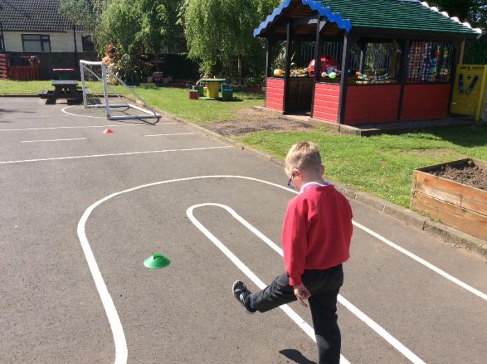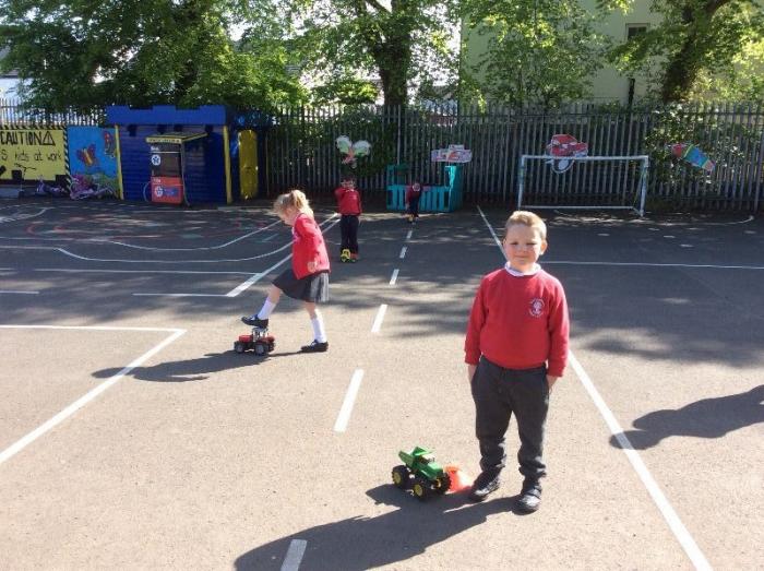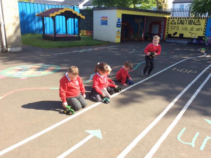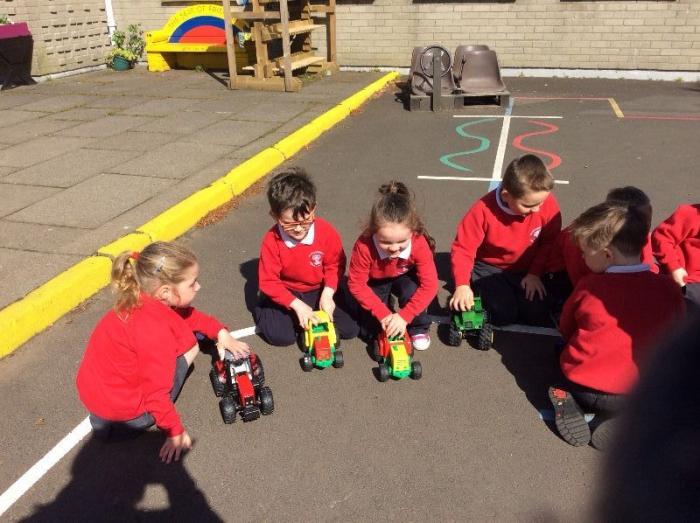 P1 celebrated Outdoor Classroom Day with an investigation using toy tractors. We wanted to find out which tractor would travel the furthest using a single push.