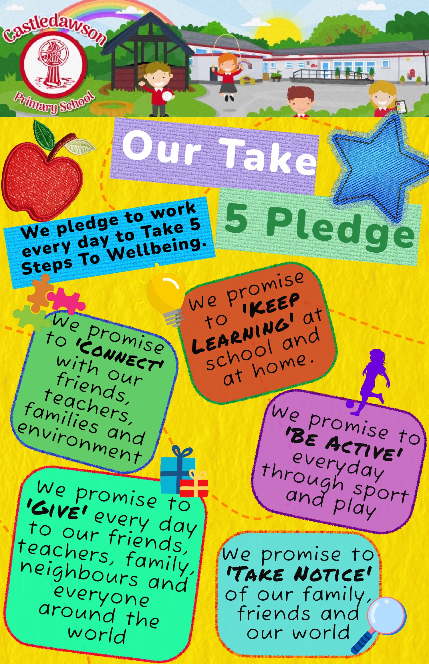 We promote the five simple steps to help maintain and improve wellbeing and aim to build these into our daily schedule – we think of them as our ‘five a day’ for wellbeing. We have achieved our Take 5 Level 3 award which is testament to the hard work and commitment to wellbeing of everyone and we are proud of our Take 5 School status.